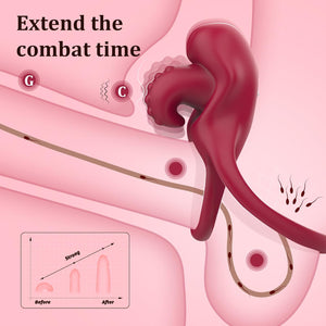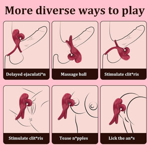 The upper ring hugs the shaft while the lower ring supports the balls and perineum. A built-in tongue flicks and vibrates against the clitoris, creating synchronized stimulation for blended clit, penile, and testicular orgasms.