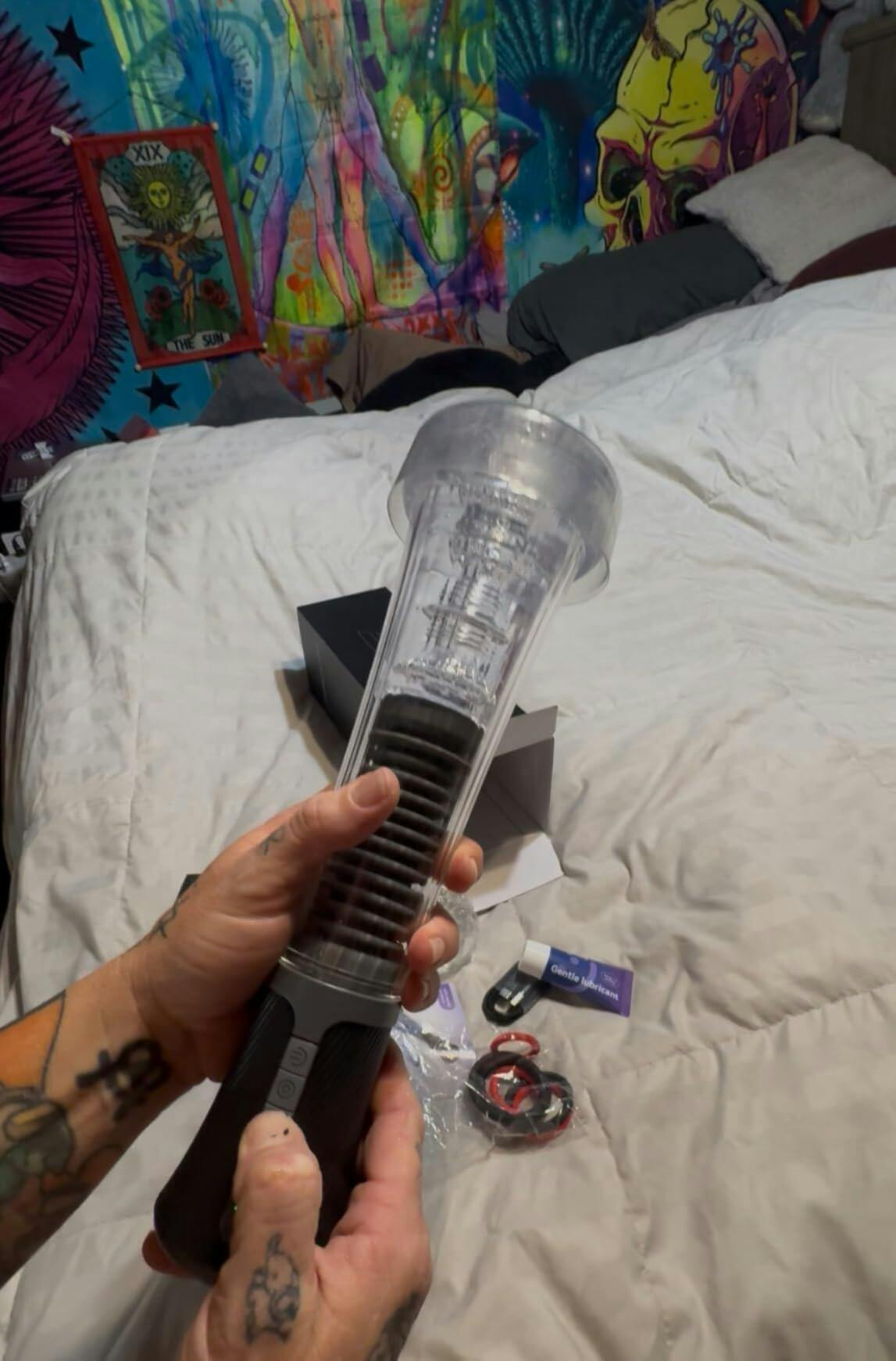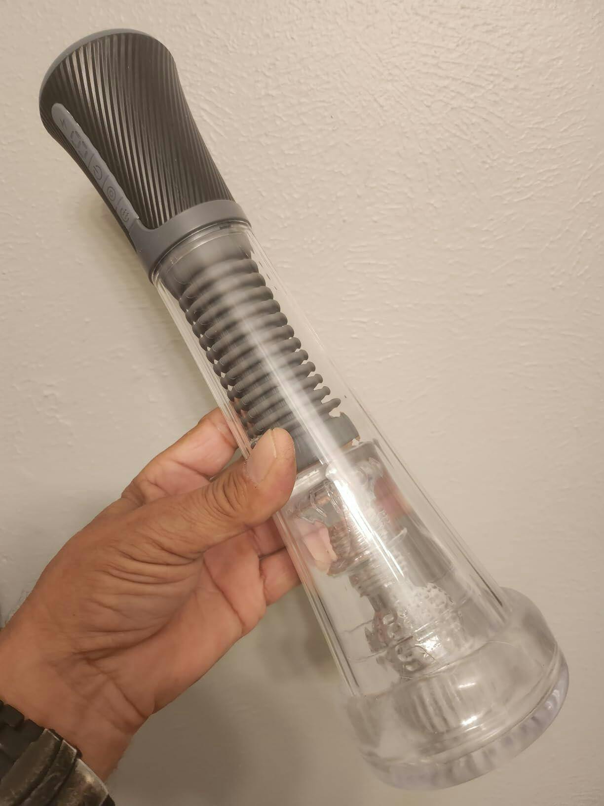 "This toy is awesome! It feels so advanced and high-tech. It's got an amazing sleek, transparent design that makes my member look awesome as it uses suction and vibration to stretch and stimulate simultaneously. It feels great. The suction, when pushed to the limits, can be painful, but when you get the pressure right, it's so pleasurable. The vibration/suction combination hits the spot perfectly and makes your nerves sing.