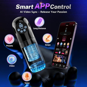AI-synced stroker with multi-motion power, suction, thrust, and rotation for next-level immersive control